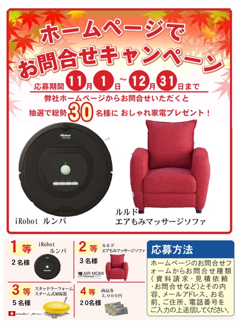 iecocoではホームページからお問い合わせいただいたお客様の中から抽選で素敵な賞品が当たるキャンペーンが11月から始まります。 この機会にiecoc...