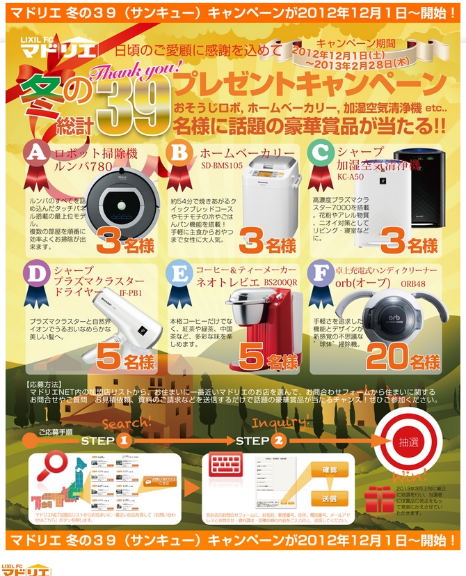 12月1日〜開始 マドリエNETを通じてお問い合わせフォームからお問い合わせやご質問・お見積り依頼・資料のご請求などを送信するだけで話題の豪華賞品が当...