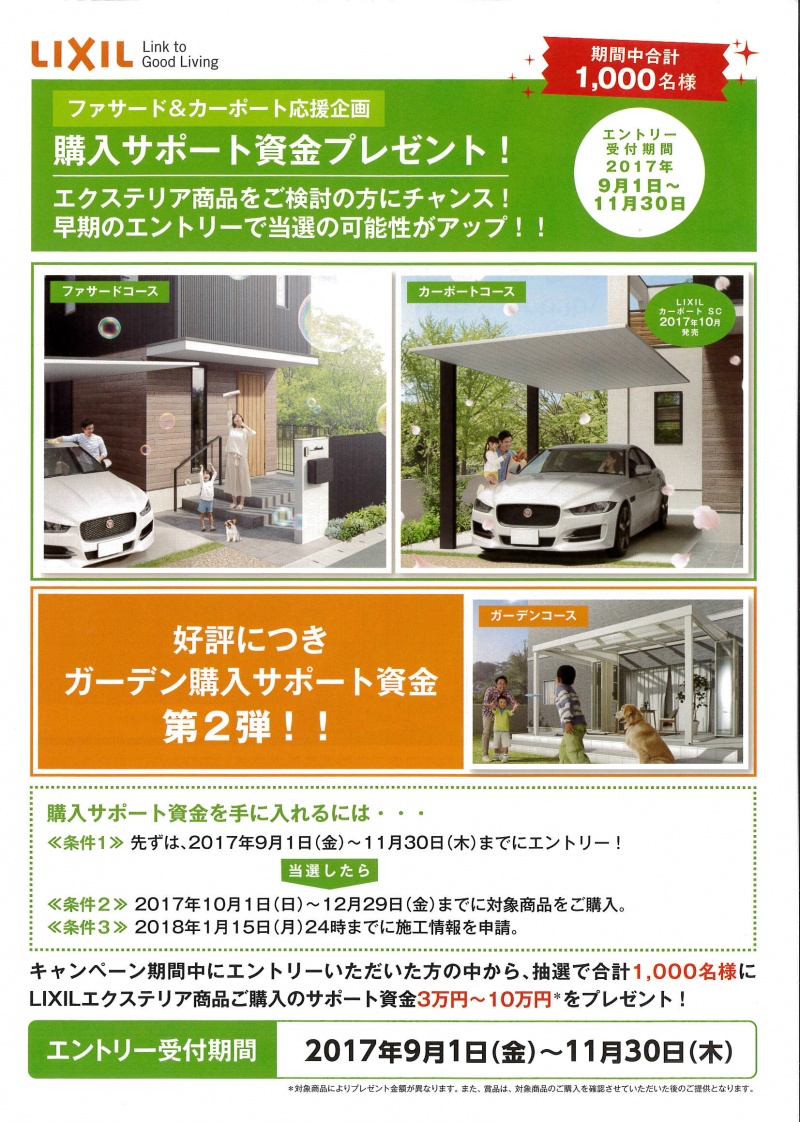 エクステリア商品をご検討の方にチャンス!! 早期エントリーで当選の可能性がアップ! エントリー期間 2017年9月1日から11月30日 キャンペーン期...