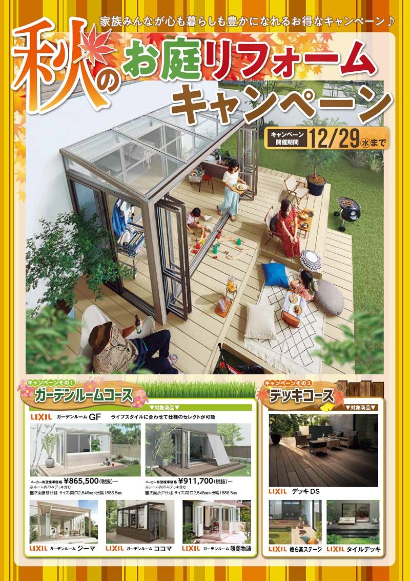 家族みんなが心も暮らしも豊かになれる御得なキャンペーン。 秋のお庭リフォームキャンペーン キャンペーン対象のガーデンルーム・デッキをご成約のお客様に ...
