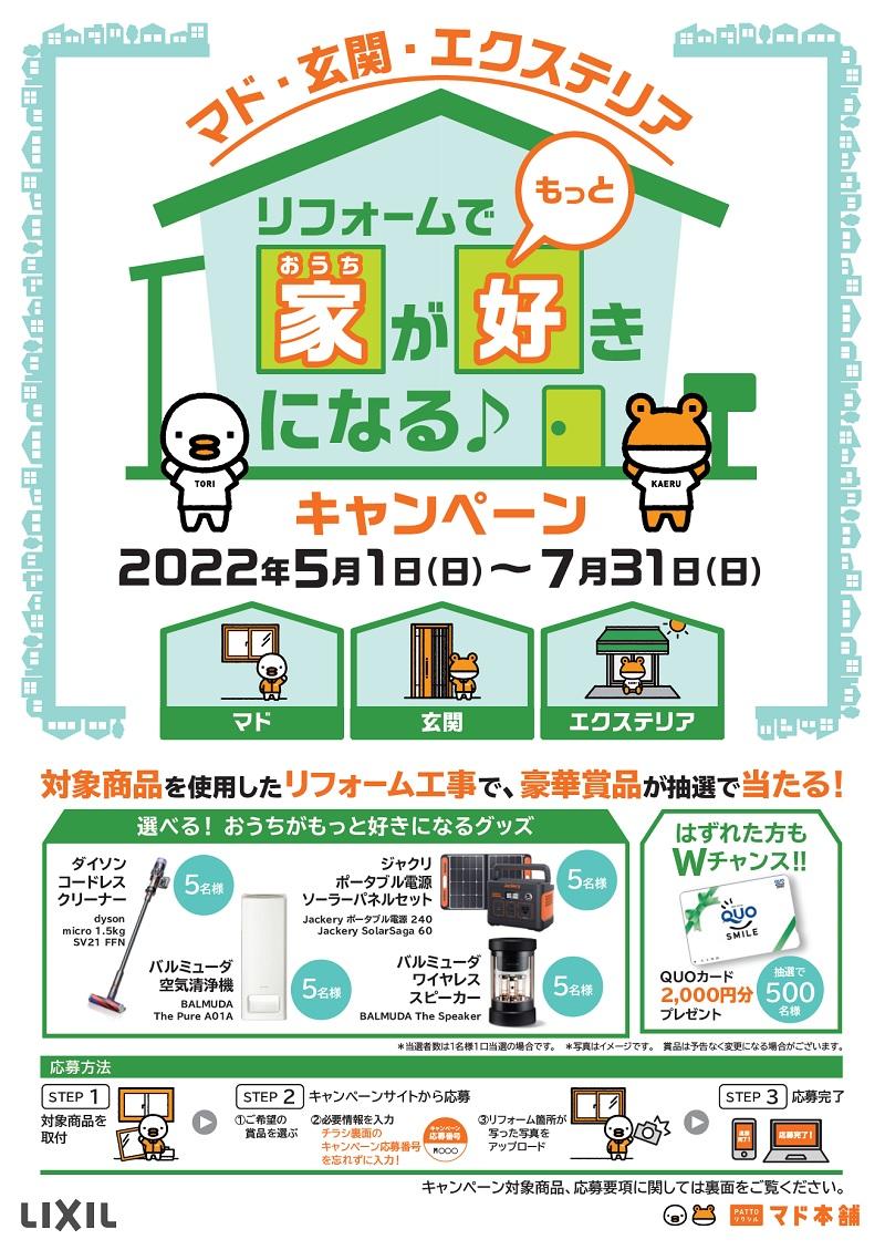 リフォームで家がもっと好きになる♪ キャンペーン 対象商品を使用したリフォーム工事で、豪華賞品が抽選で当たる! 2022年5月1日(日)~7月31日(...