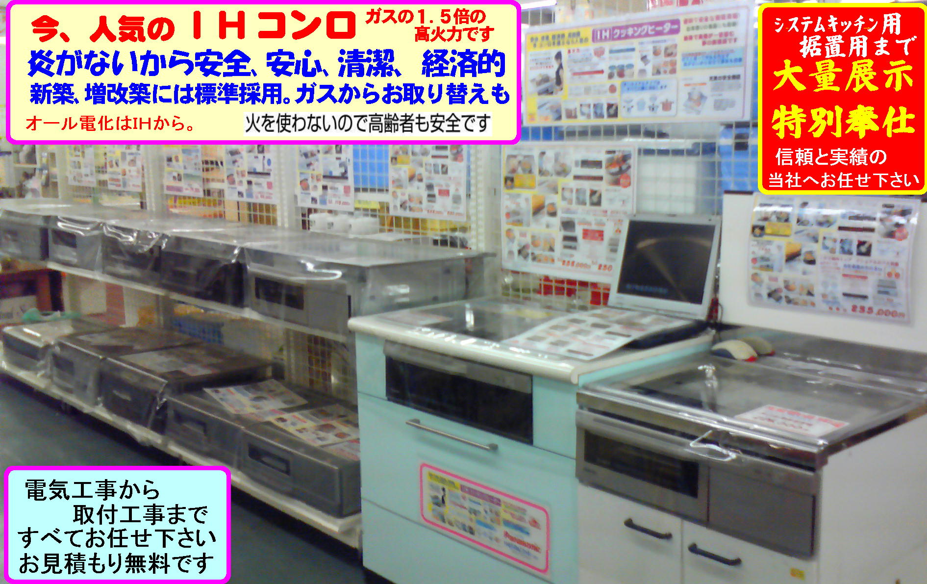 オール電化にはかかせない、奥様夢の調理器IHコンロ大量入荷特別奉仕中です。 是非、ご来店頂き多くの商品をご覧になって下さい。
