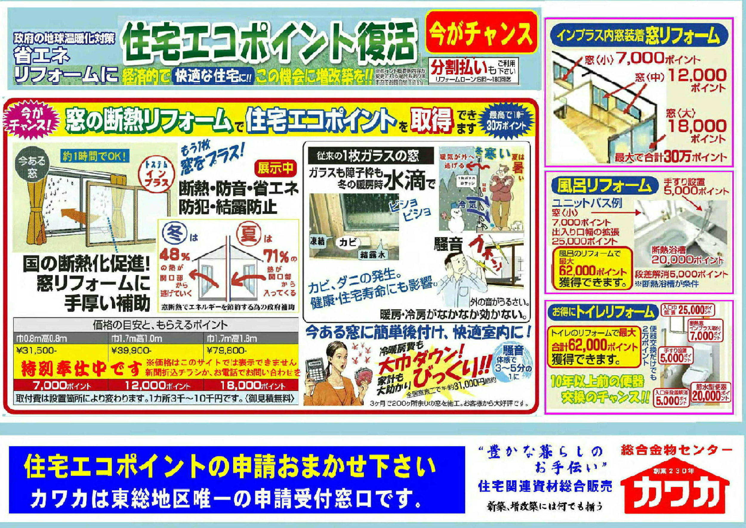 住宅エコポイント復活しました。リフォームのチャンスです。本年度末までですが予算がなくなり次第終了します。 断熱窓リフォーム、風呂リフォーム、トイレリフ...