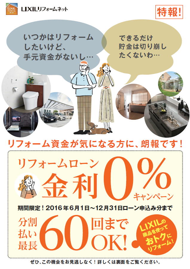 LIXIL製の製品をお買上の方に限り、リフォームローンの金利が今ならかかりません! 無金利でリフォームできます! 詳しくはお問い合わせ下さい(^^)