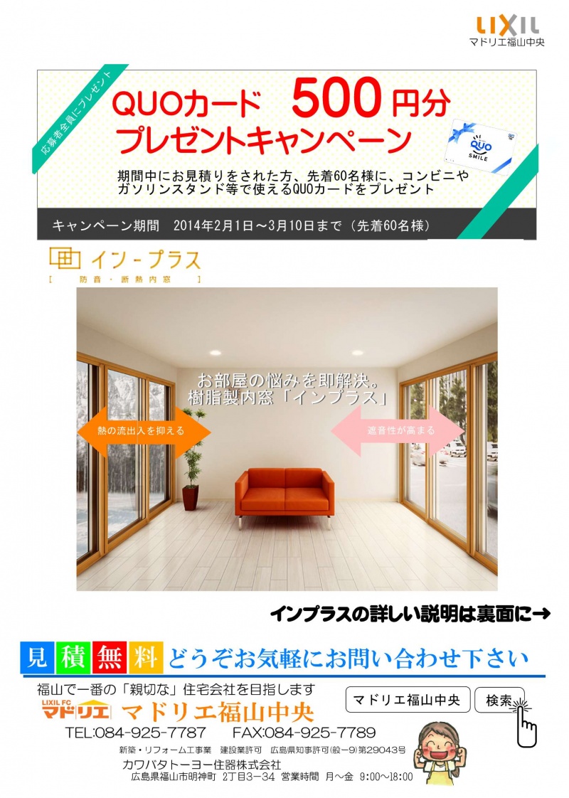 2月1日より3月10日の間、インプラスのお見積り依頼をして頂いた方、 先着60名様限定で、コンビニやガソリンスタンドなどで使えるQUOカード 500円...