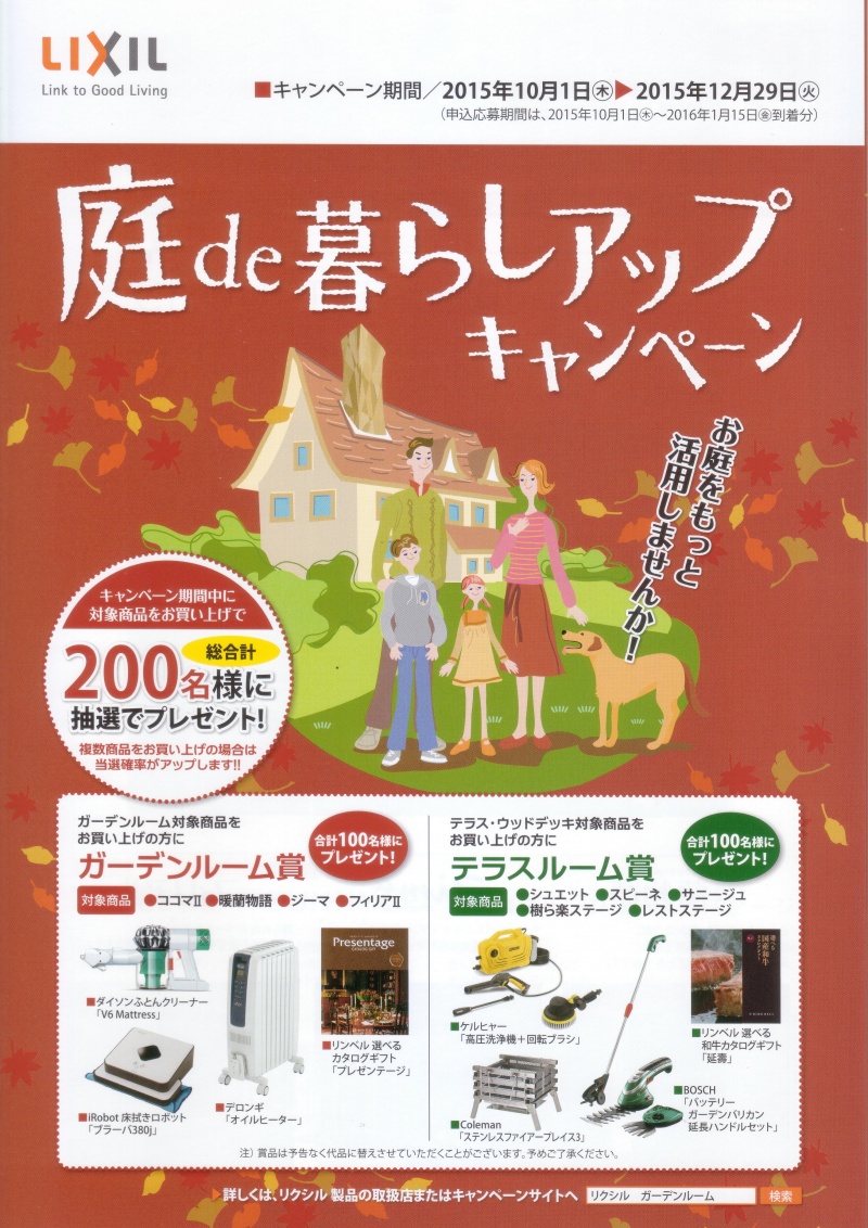 庭de暮らしアップ キャンペーン 2015年10/01から2015年12/29まで 内容は外構、家の外にあるサンルームなどです 主な商品です&darr...