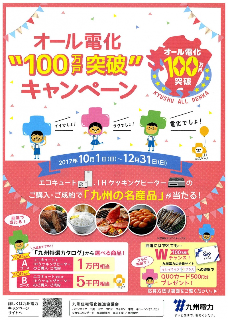 九州電力さんのキャンペーンのご案内 ↓↓↓ オール電化”100万戸突破”キャンペーン