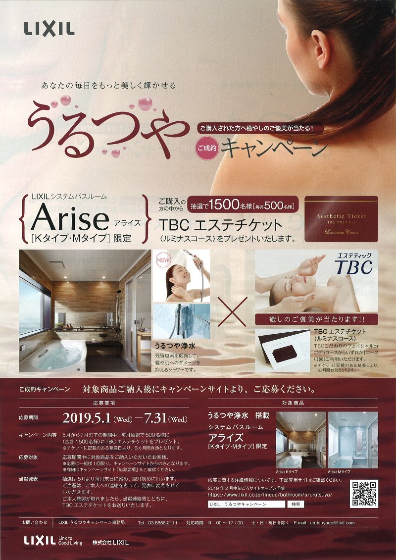 LIXILシステムバスルーム Ariseアライズ[Kタイプ・Mタイプ]限定 ご成約キャンペーン!! ご購入の方の中から 抽選で毎月500名様にTBCエ...