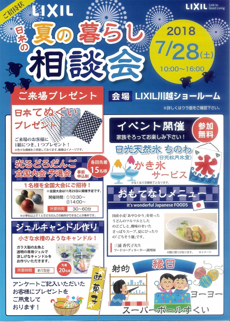 夏の暮らし相談会 2018年7月28日10:00〜16:00 会場:LIXIL川越ショールーム ↑クリックして大きくし...