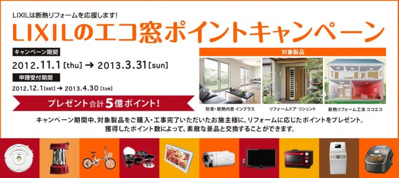 LIXILより、 エコ窓ポイントキャンペーンが 開催されることが決定いたしました!! 対象期間は 2012/11/1〜2013/3/31...