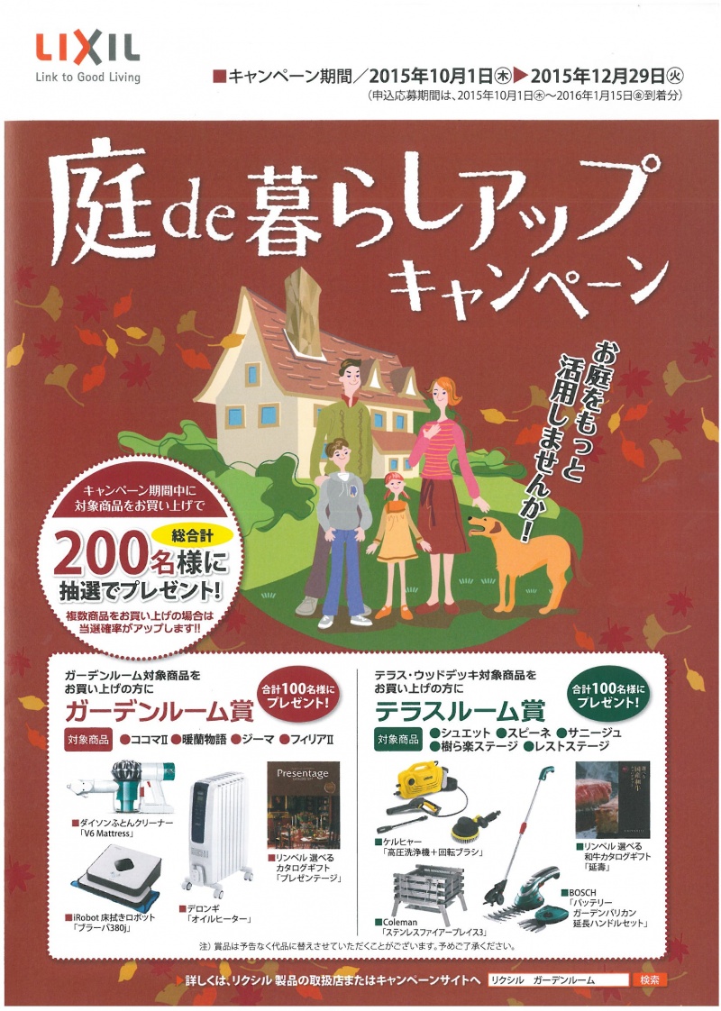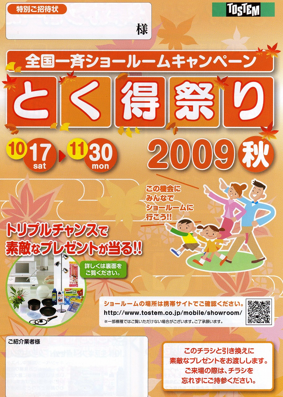 全国一斉ショールームキャンペーン 2009 秋 とく得祭りを開催致します! 期間:10月17(土)〜11月30(月) このチラシと引き換えに素敵な...