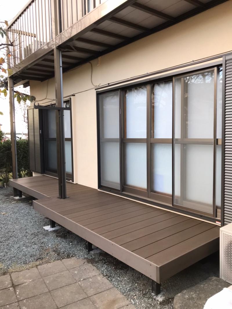 人工木なので腐る心配もない!半永久的にご使用できるデッキ。 v 築年数45年経過のN様邸。ご近所さんとのお茶のみの交流に。洗濯干しの際などの出入りに重...