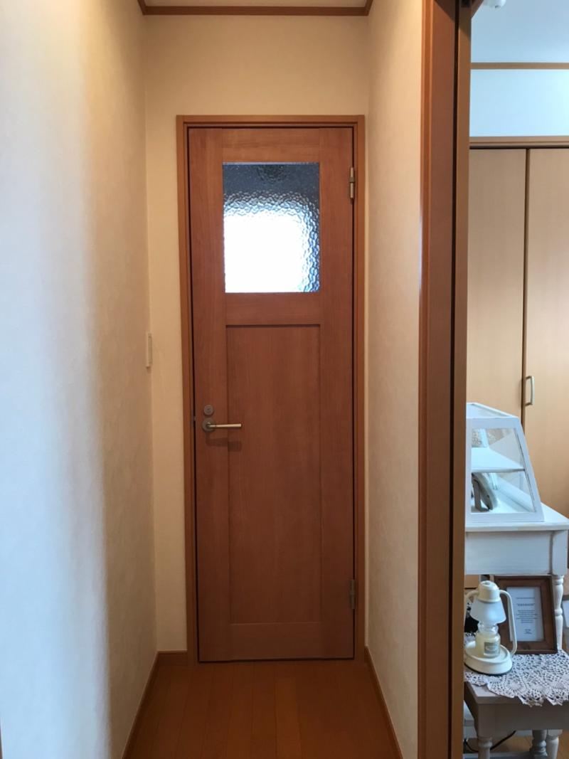 築19年K様よりトイレドア本体の交換依頼です。 玄関から入って真正面のトイレドアは小さな明り取りがある仕様です。このように開けはなしてみると・・・トイ...