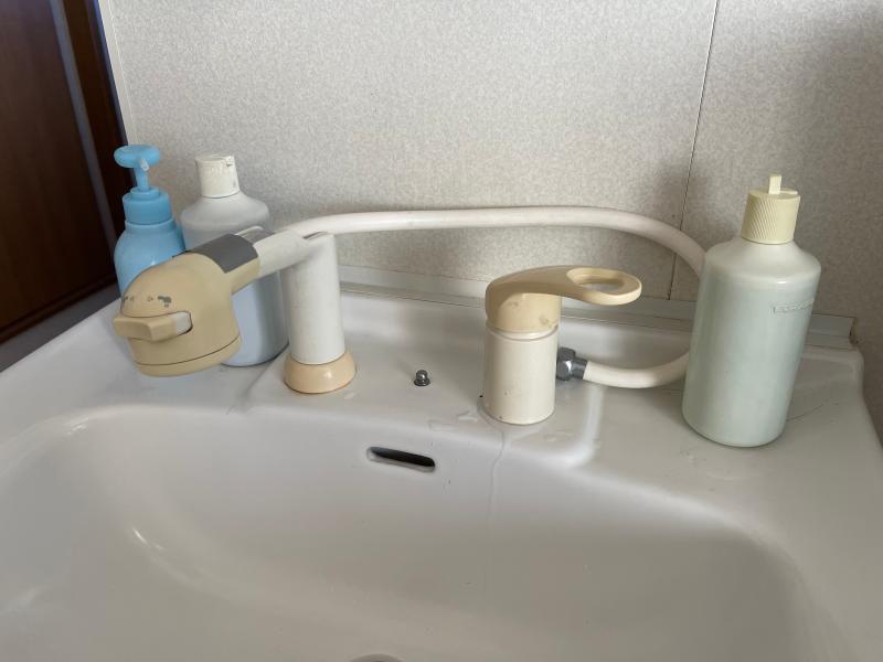 以前ある店舗に取り付けてあったシャワー水栓付きの洗面台ですがシングルレバーの水栓の取り付け位置から水漏れが・・。 施工前 早速現物見せていただいてメー...