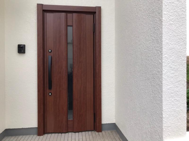 まだまだ使えそうな玄関で取替するのが勿体ない気がしますがお客様の依頼でリシェント玄関 :断熱仕様:G12型 色はポートマホガニー 内 外額縁納でスッ...