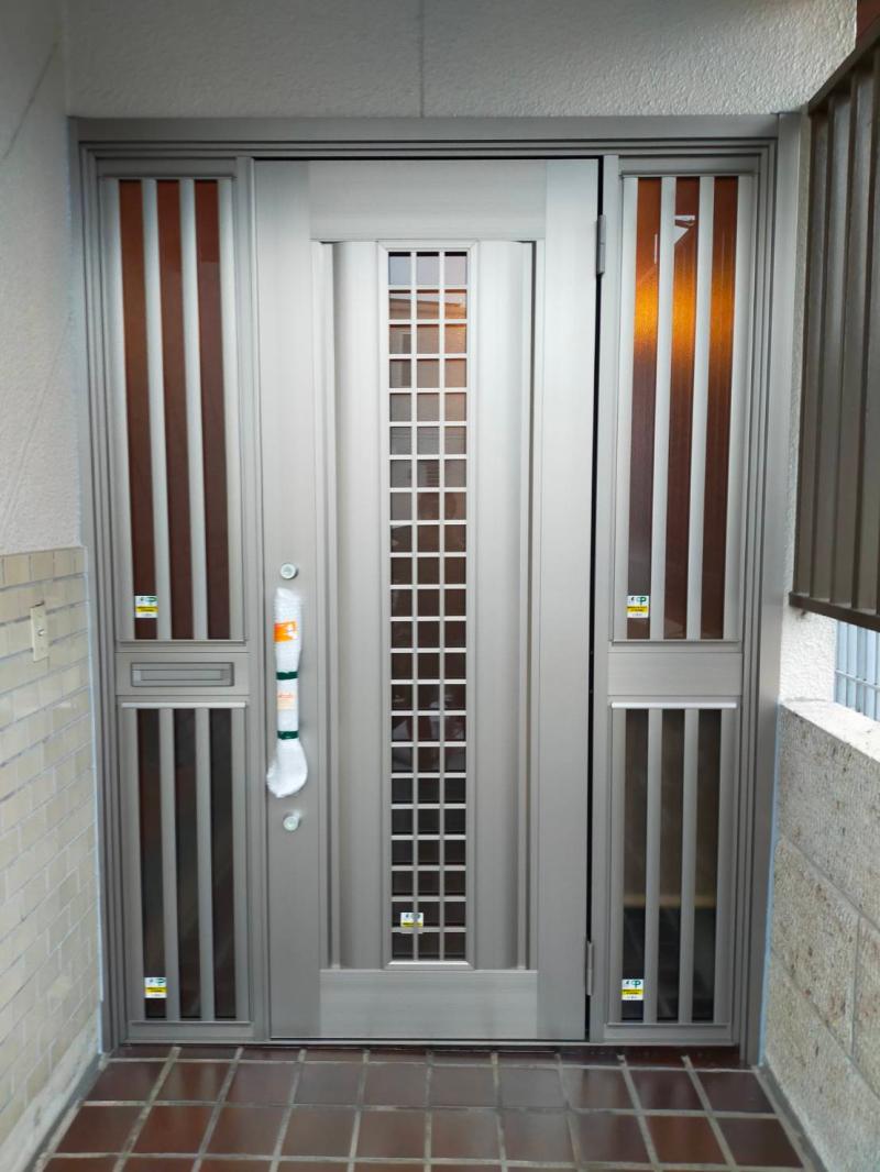 リシェント 玄関ドアー3 両袖飾り ポスト付 色はシャイングレー C20型 特注サイズになりましたがピッタリ納まり依然と全然違う玄関の雰囲気になり大変...