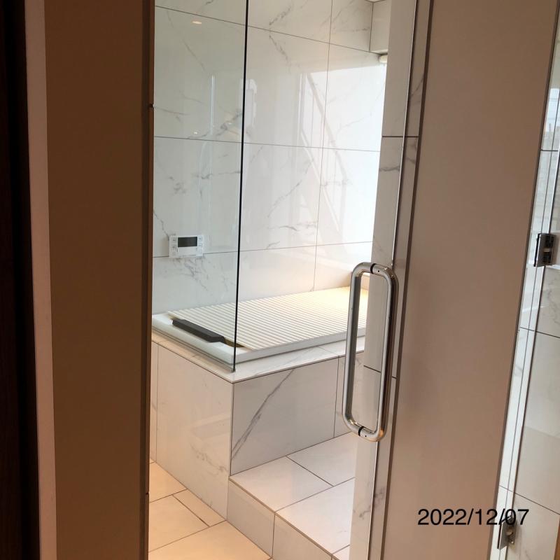 こんにちは! 先日浴室ドアとシャワースクリーンの施工をさせて頂きました。 <施工後> 強化ガラスで造作しました。 まさに高級ホテルな仕上がり!!! 中...