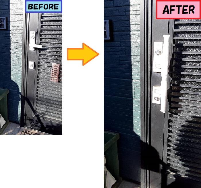ドアのハンドル交換をさせていただきました。 現場:二宮町 レバーハンドルから、バーハンドルへ交換 ハンドルを外すと… AFTER拡大 既...