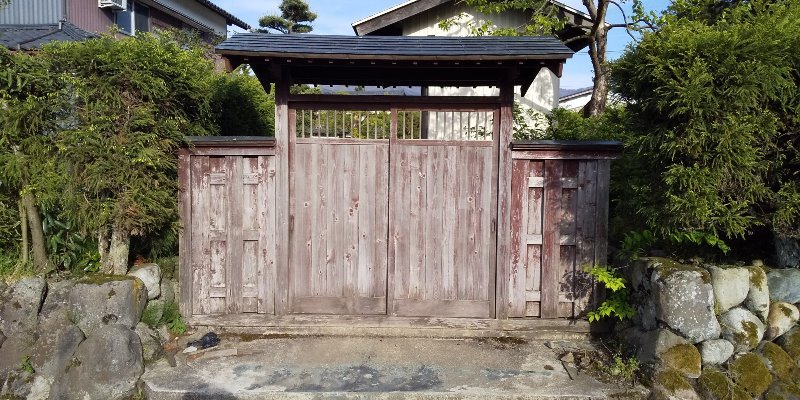 福寿門 (切妻屋根付き 両袖付き 連子格子タイプ) 木製の門戸からアルミ製の門戸への取替工事でした。 ↓ 何十年もの歳月で色褪...