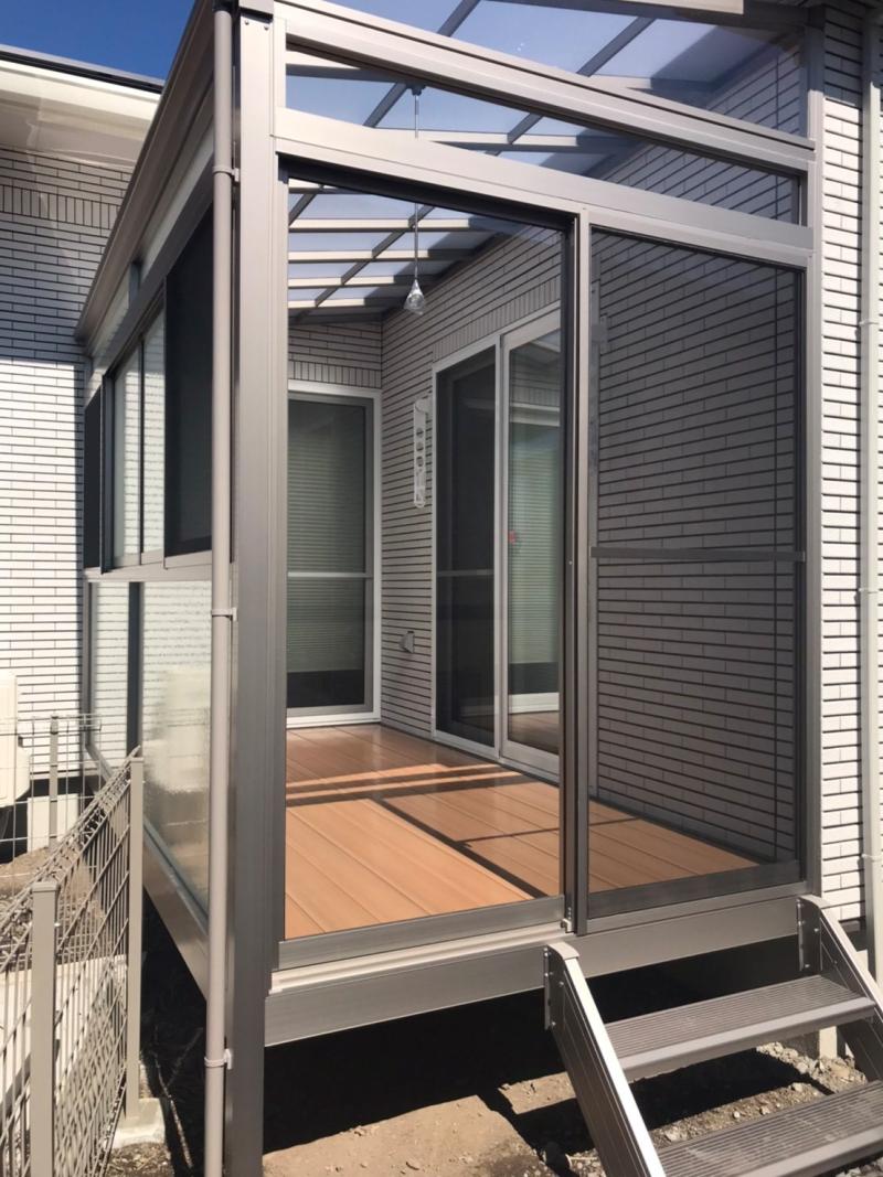【施工後】 【施工前】 サニージュ土間納まりをウッドデッキの上に納めました。 壁にレンガが貼ってあるのと、戸袋があり出幅を加工して納めました。