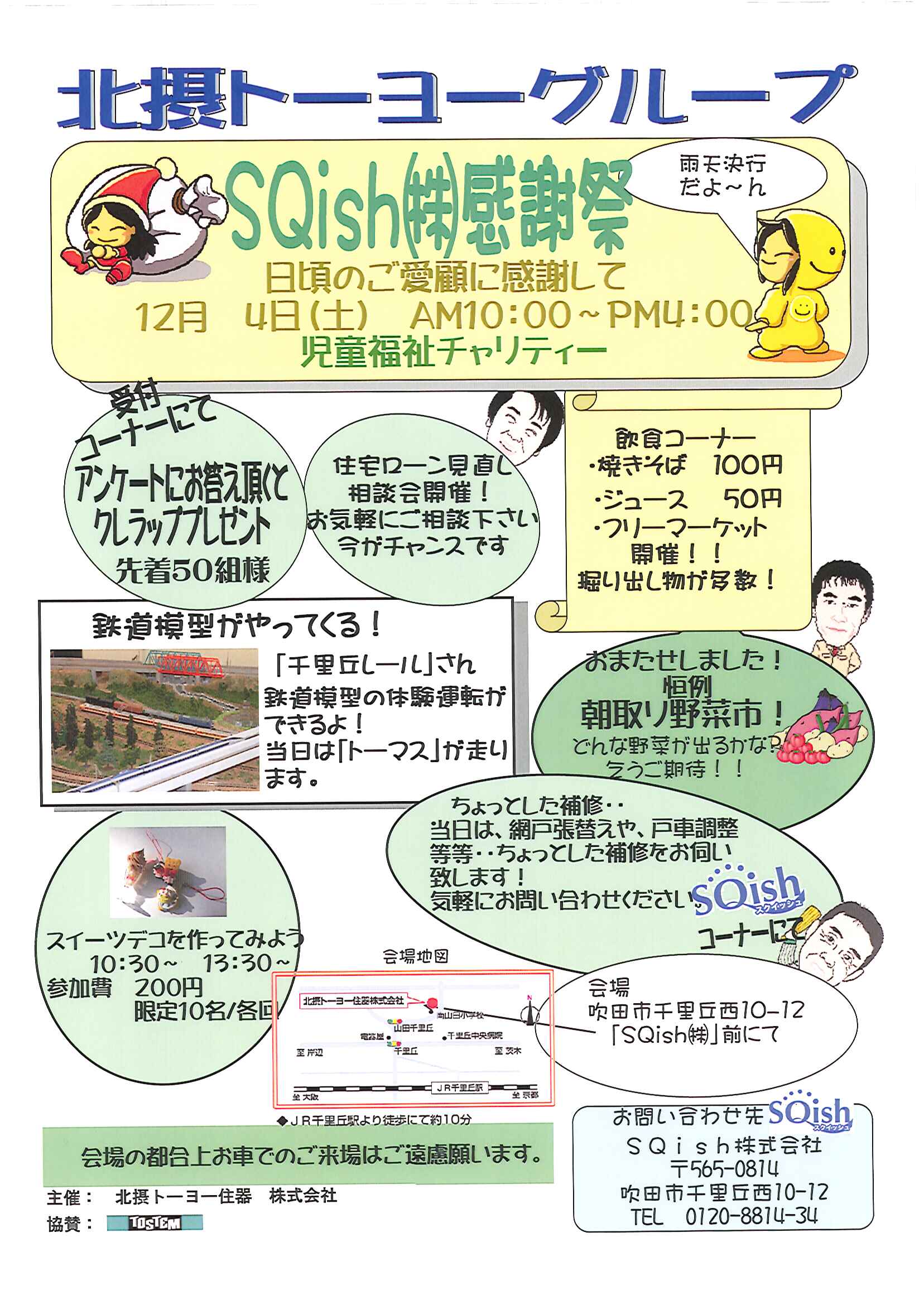 北摂トーヨーグループ「SQish感謝祭」 開催のお知らせ 12月4日(土)午前10時〜感謝祭を開催します。 今回もイベント盛りだくさんです! 例) ...