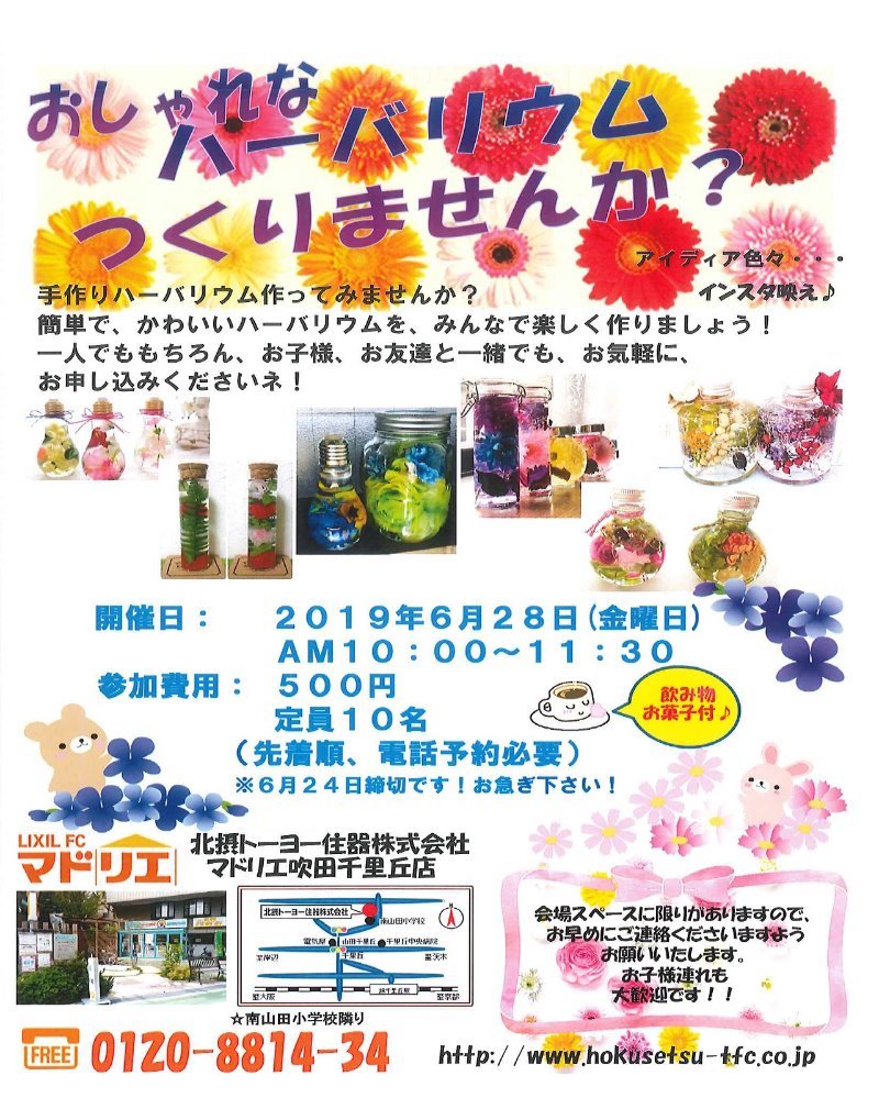 マドリエ吹田千里店イベントの日にちが決まりました!! 2019年6月28日 (金曜日) 10:00〜11:30 今回は、おしゃれなハーバリウムつくりま...