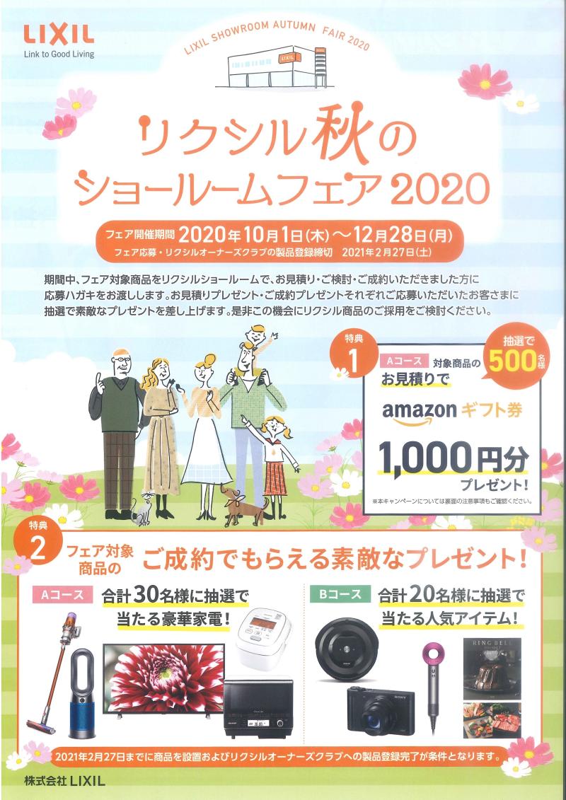 リクシル秋のショールームフェア2020 フェア開催期間:2020年10月1日㈭~12月28日㈪ 期間中、フェア対象商品をリクシルショールームでお見積り...