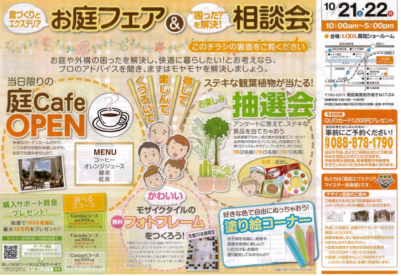 10/21・22の二日間LIXIL高知ショールームで開催のお庭フェア&相談会のチラシが出来ました。 台風の接近もちょっと心配ですが皆さんのご来場お待ち...