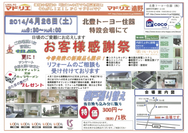 以前、手配り等でLIXILイベントの案内をしていましたが 2月29日(土)LIXIL盛岡ショールームで予定しておりました 「新築・リフォーム春のフェア...