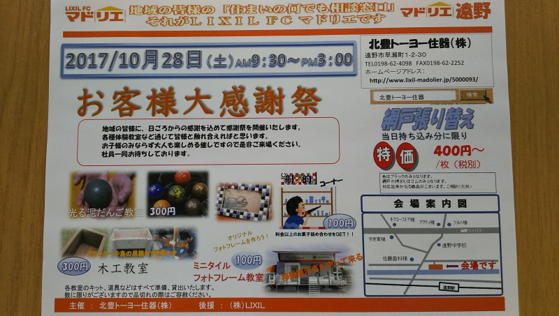 2017年10月28日(土) 9時半〜15時 お客様大感謝祭!! 今回は、ちびっこ達に喜んでもらえるように どろだんご教室、...