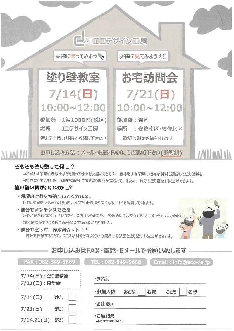 株式会社 エコデザイン工房様 塗り壁教室とお宅訪問会のご案内です。 塗り壁教室 7月14日(土) 10:00〜12:00 場所:エコデザイン工房 お宅...