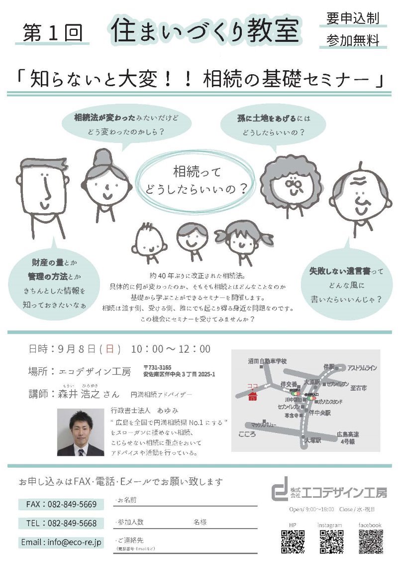 株式会社 エコデザイン工房 様 第1回 住まいづくり教室 「知らないと大変!!相続の基礎セミナー」 というセミナーが開催されます 相続とはどんなことな...