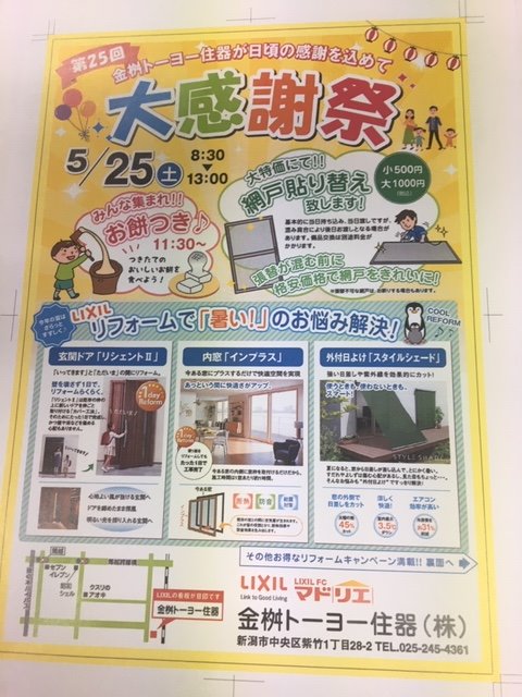 明日、金桝トーヨー住器の感謝祭を開きますので、是非足を運んでみてください。 網戸張替なども賜ります。 餅つきも開催しますので、突きたてのおもちも食べら...