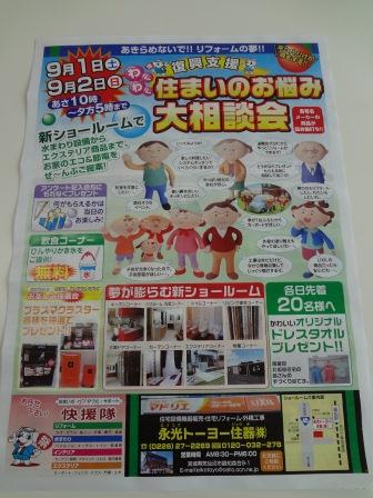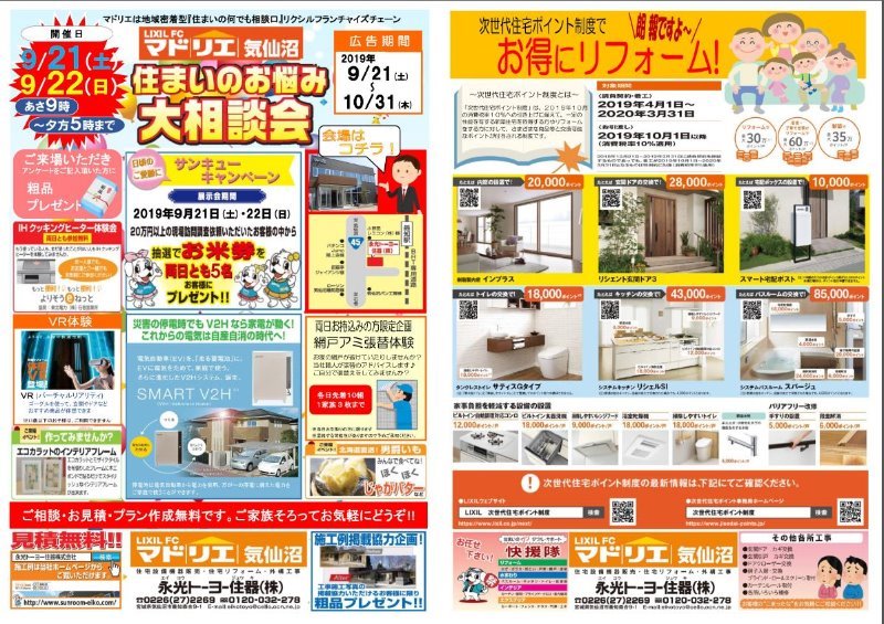 9月4日5日に、展示場オ−プン1周年記念 展示会を開催 致します。 昨年、9月に開催した リフォ−ム相談会も3回目となり、今回は展示場...