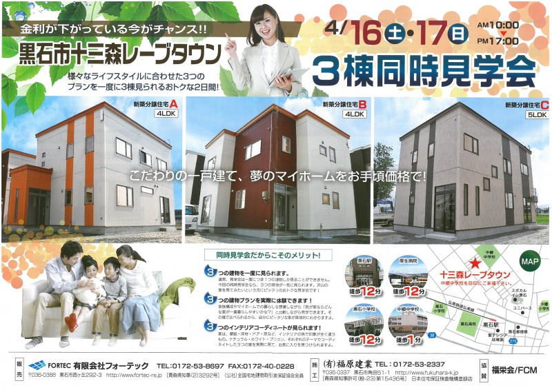 4月16日 土曜日 4月17日 日曜日 AM10:00〜PM17:00 黒石市十三森レーブタウンにて 3棟同時見学会開催!! 様々な...
