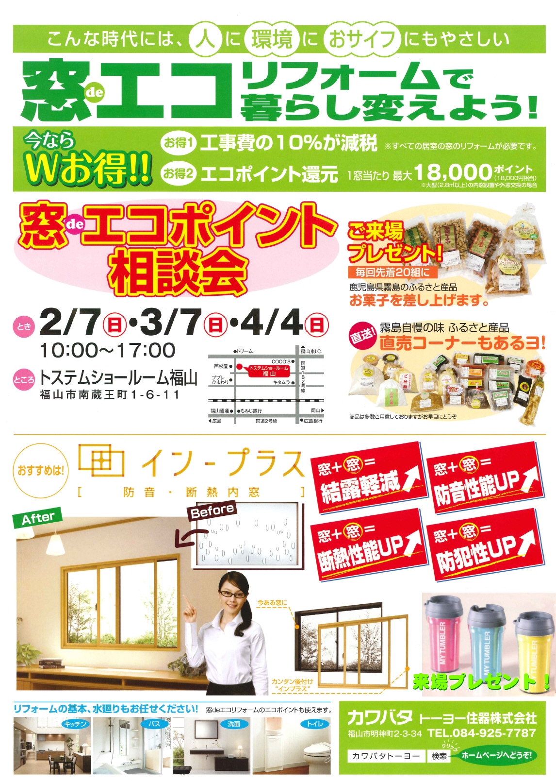 3月7日にトステムショールーム福山にてカワバタトーヨー住器㈱の窓リフォーム相談会を開催します! トステム商品のインプラスをつけることで、国からエコポイ...