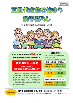 横手市では 三世代同居・近居促進のために 住まい支援事業補助金制度を開始しています。 中学生以下(出産予定も含む)のお子様がいて三世代が 新たに同居ま...