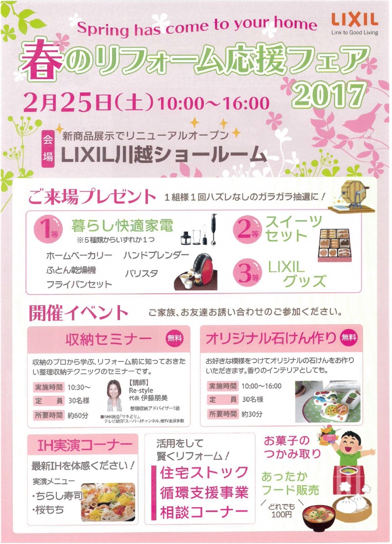 LIXIL川越ショールームにて「春のリフォーム応援フェア1027」開催します 2月25日(土)10:00〜16:00 ←拡大してみてね &l...