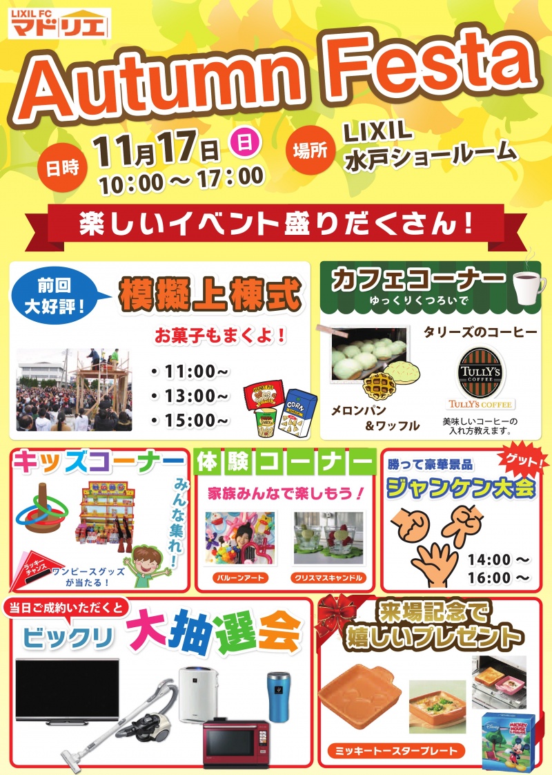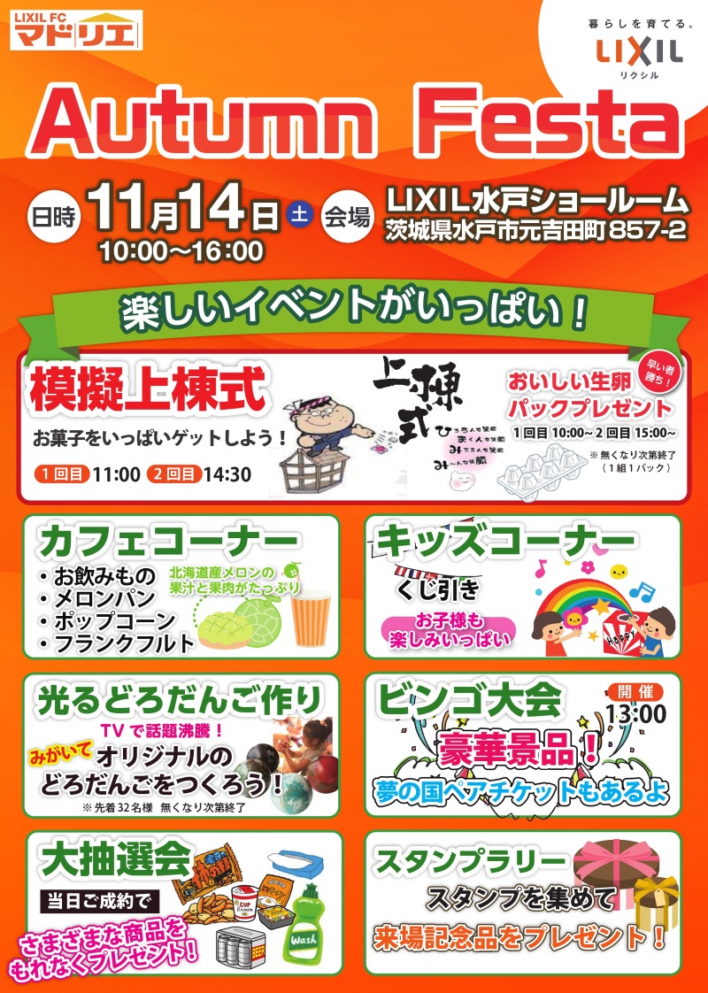 Autumn Festa 前回大好評の模擬上棟式やります! 豪華景品のビンゴ大会もあり 楽しいイベント盛りだくさん(*≧▽≦)bb また、ご来場者限定...