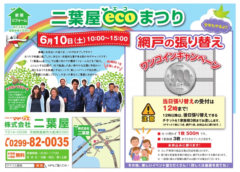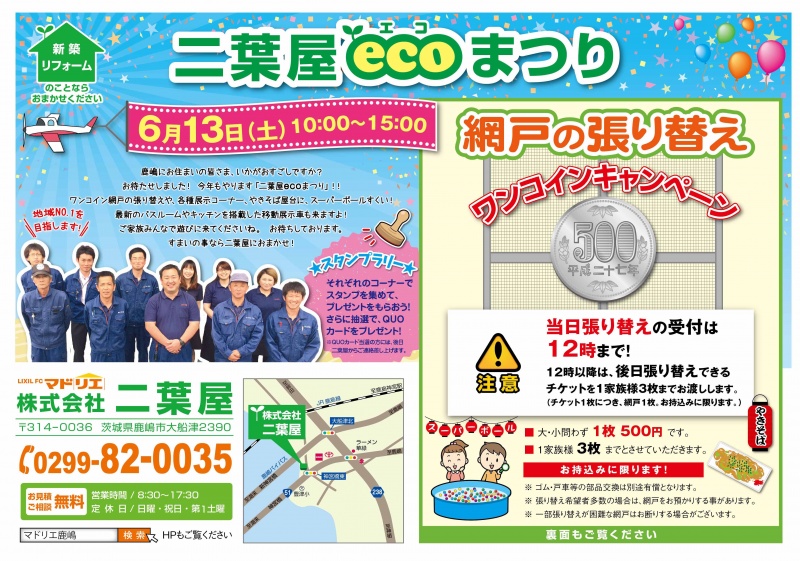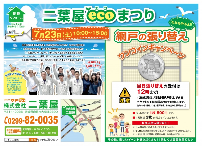 7月23日(土) 第10回二葉屋ECO祭り開催決定!! 毎年大好評の網戸張替え今年もやっちゃいます!! 破格の500円!!!! ※一家族...