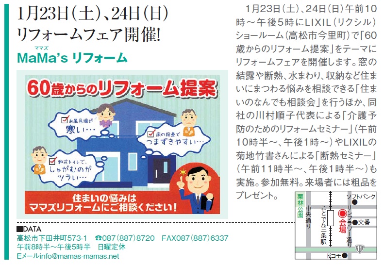毎日お疲れ様です☆ 本日はイベントのお知らせです。 1月23日(土)、24日(日)の2日間 MaMa`sリフォームさんによる 「60歳からのリフォーム...