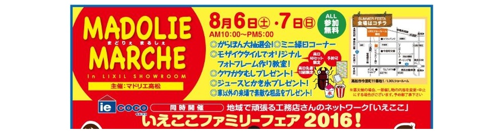 「まどりえまるしぇサマーフェスタ2017」 開催のご案内! 今年も高松市今里町にあるLIXILさんのショールームをお借りして 年に一...