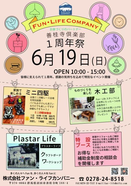 Fun・LifeCompany 1周年祭 6月19日(日) OPEN 10:00~15:00 皆様に支えられて1年。 感謝を込めて特別なイベントを開催...