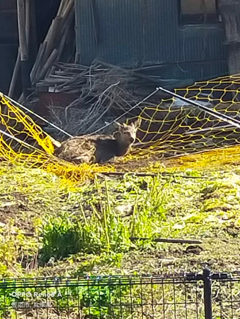 現場作業中、野生の鹿に遭遇!! 畑のネットに角がひっかかり動けなくなってるではないですか!? もがいてたけど、あきらめておとなしくなりました。 あきら...