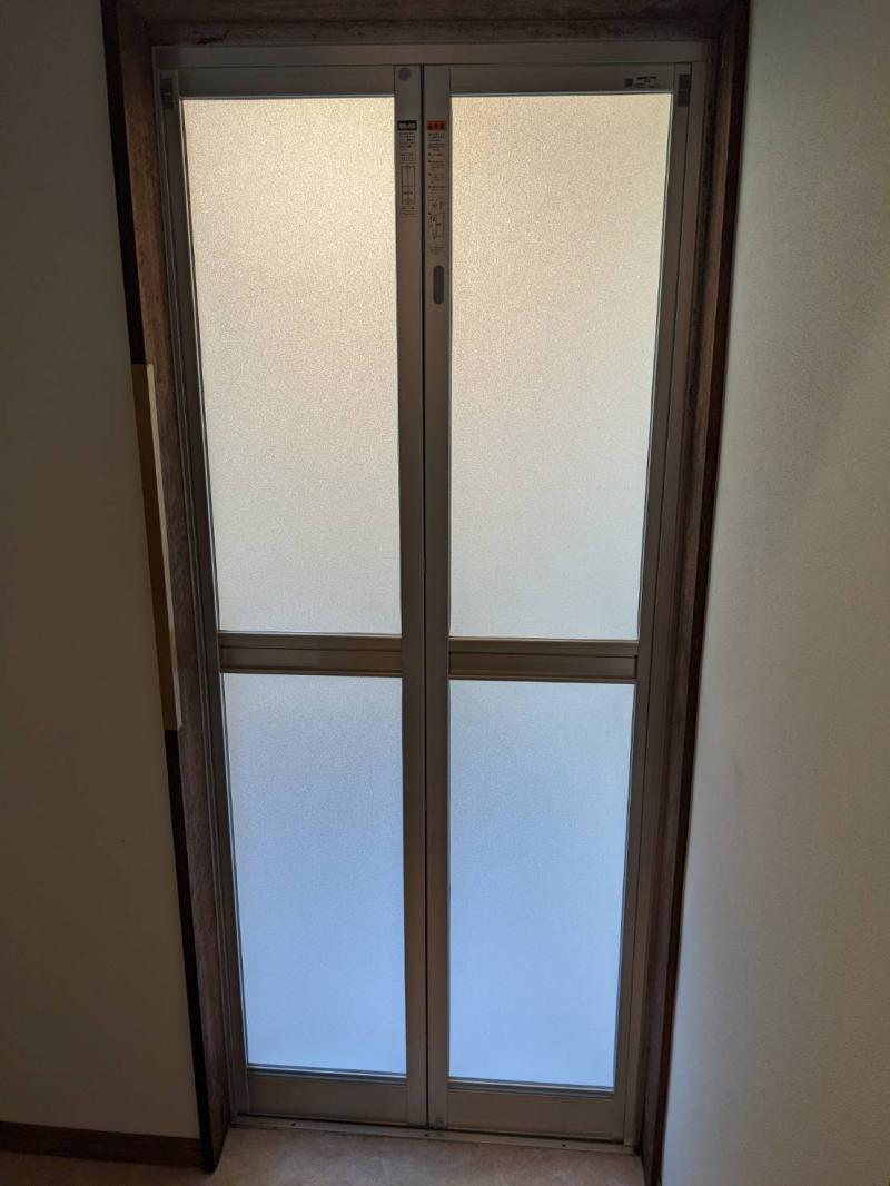 浴室ドアの取替えをさせていただきました! 浴室中折れドア SF型 内付型 樹脂パネル入り 完成品 シルバー 施工後 (← 外/中 &rarr...