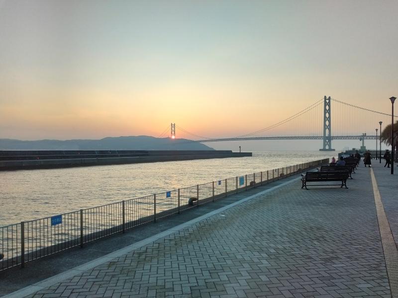 こんにちは。 先日、たまたまですが、 明石海峡大橋に夕日が丁度さしかかった時に 写真を撮る事が出来ました。 ラッキー♡
