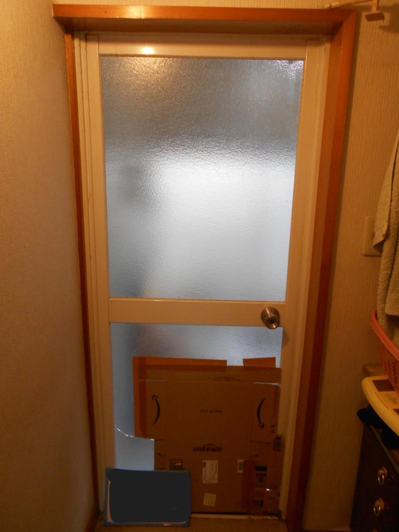 ガラスが割れてしまった浴室ドア これを機に、割れない樹脂パネルを採用したリフォーム浴室ドアに交換 把手も握り玉からレバーハンドルになり使い勝手も向上し...