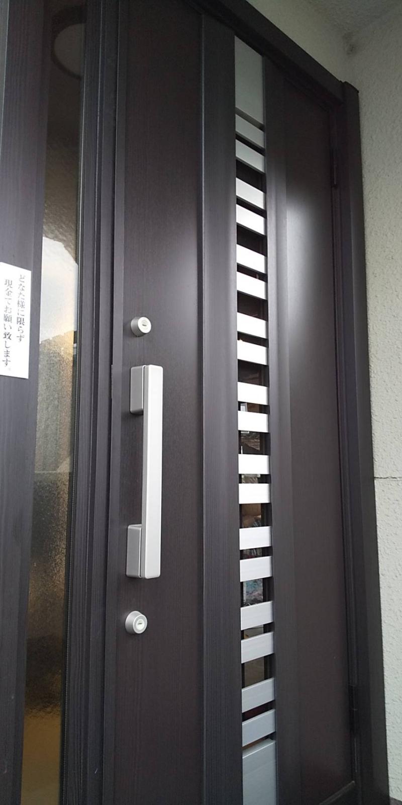 玄関引戸リシェント 元々ついていたランマを外し、大きくしました 開閉が重たく、鍵のかかりが悪く戸締りが不安だったそうで、思い切ってリシェント工事をお願...