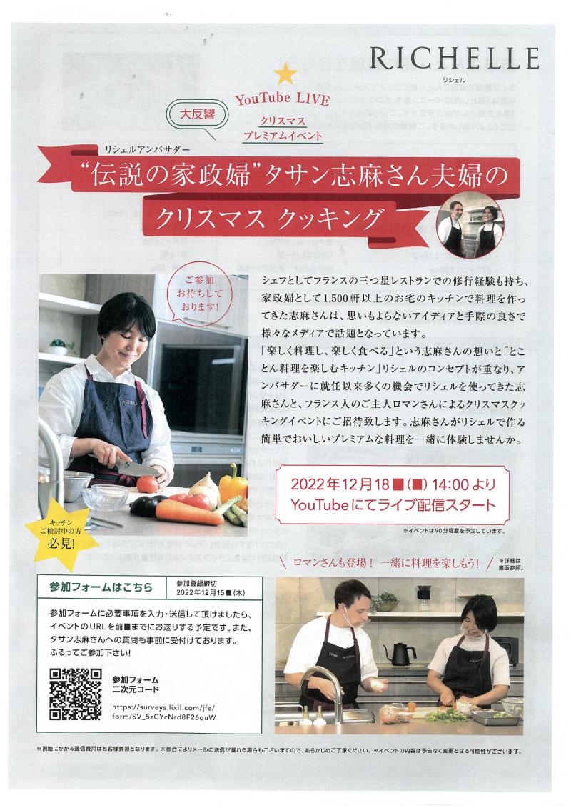 12月18日(日)14時より あのタサン志麻さんのクリスマスクッキングの 配信があります。 今回はご夫婦でクリスマスのディナーにお試しいただける 「豚...