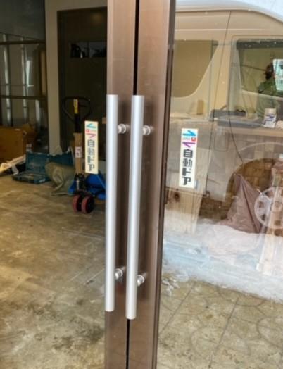 店舗の改装に伴い、以前は自動ドアだった入口に 押し棒を取り付けて、手動で引き分けの開閉としました。 引戸本体の縦框に穴あけ加工をして 両面に押し棒を取...
